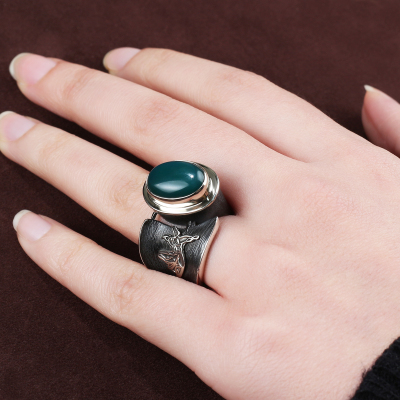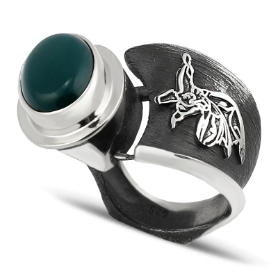 SEMAZEN FİGÜRLÜ YEŞİL AKİK TAŞLI GÜMÜŞ BAYAN YÜZÜK